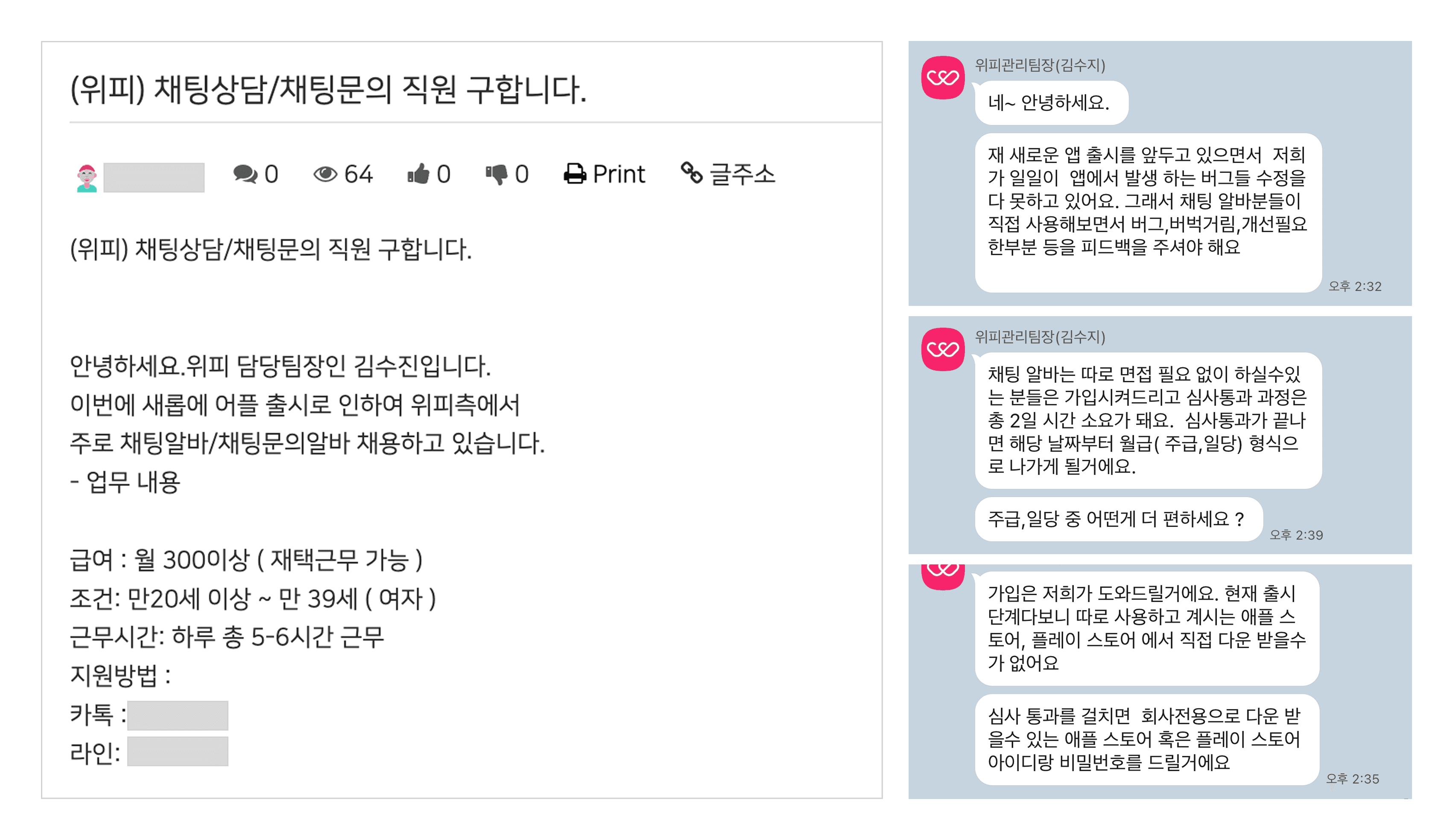 "위피 채팅 알바" 모집을 가장한 접근