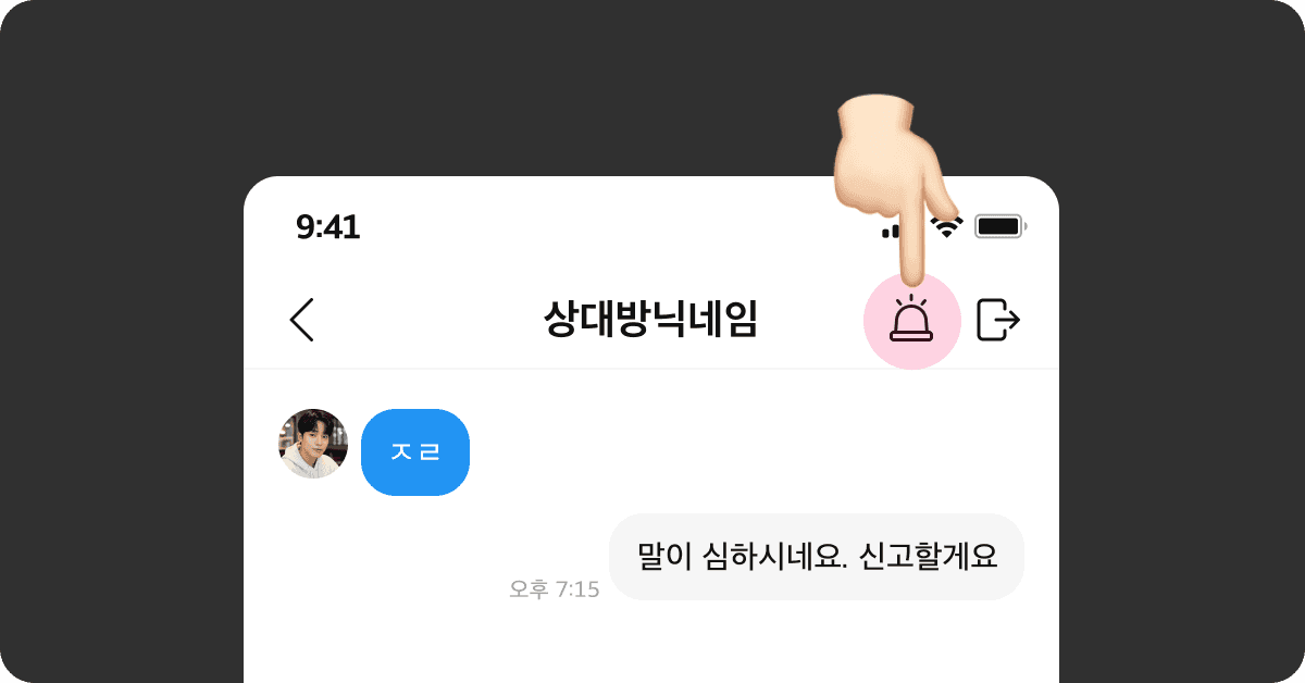 채팅방 상단의 신고 버튼을 통해 신고해주세요. 유저 프로필에서도 신고가 가능하지만, 채팅방에서 신고해야 상황을 정확히 전달할 수 있어 지킴이가 빠르고 정확하게 대응할 수 있습니다.